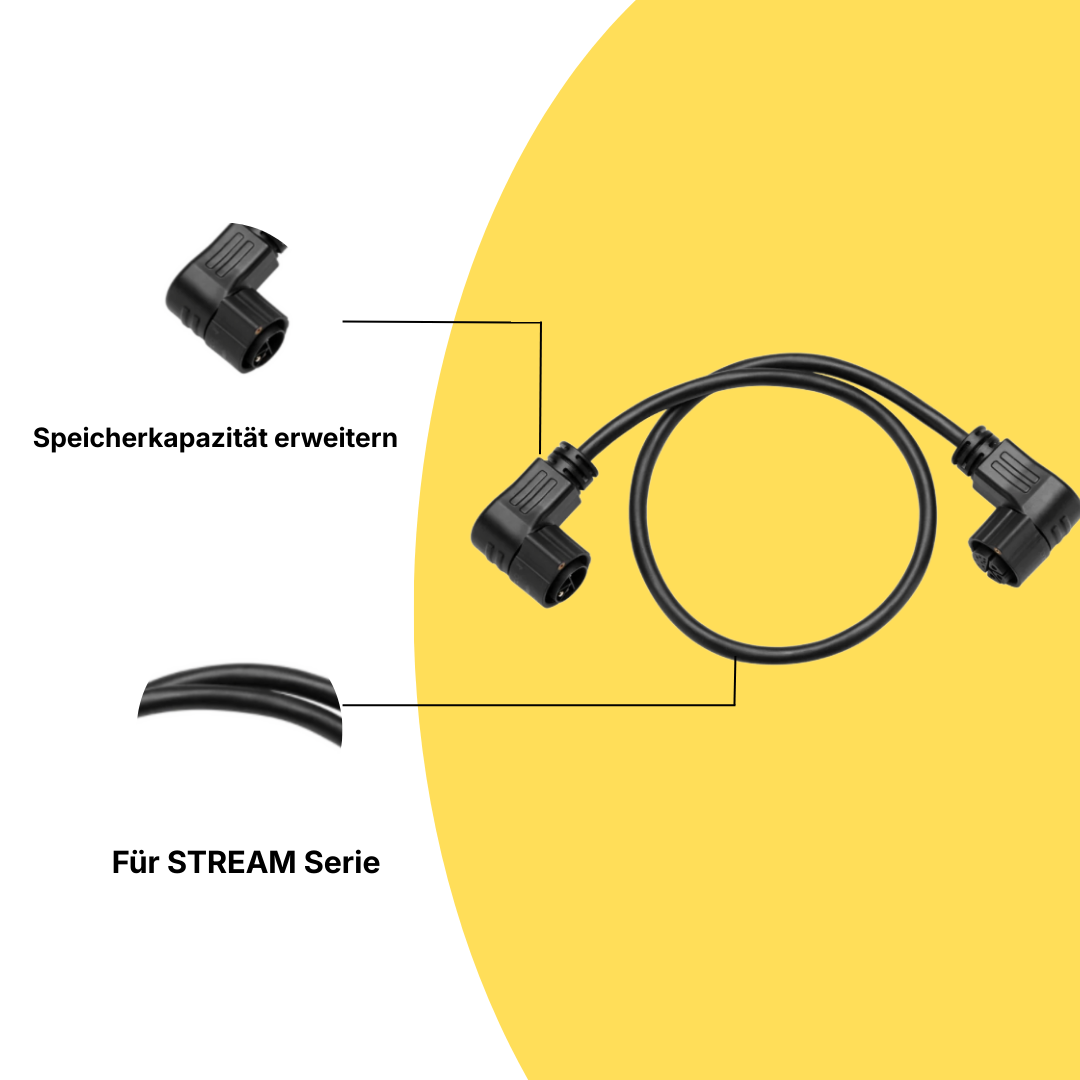 Zur Erweiterung der Speicherkapazität können zwei Batterien der EcoFlow STREAM Serie (z. B. EcoFlow STREAM Ultra, STREAM Pro oder STREAM AC Pro/AC) mit dem EcoFlow STREAM Parallelkabel parallelgeschaltet werden.