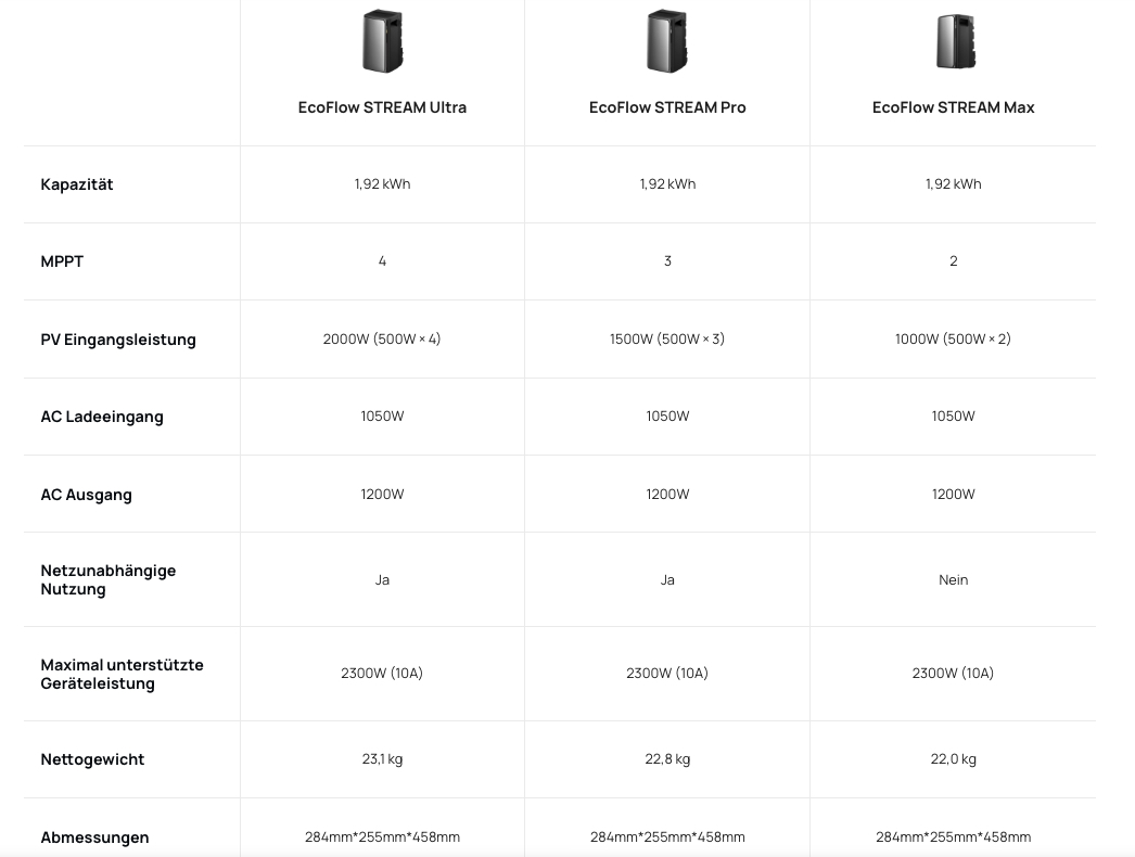 Die Speicher der EcoFlow STREAM Serie gibt es in den Typen: Max, Pro und Ultra