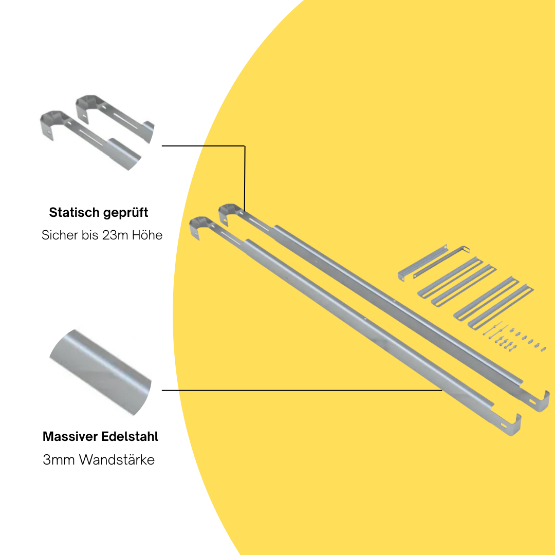 Diese Gitter-Balkonhalterung ermöglicht die sichere Montage eines Solarmoduls an einem Balkon mit Geländer – ganz ohne Bohren oder Eingriff in die Bausubstanz. Gefertigt aus robustem, KTL-beschichtetem Stahl (ca. 3 mm Stärke), entwickelt und produziert in Deutschland. Statisch geprüft für Gebäude bis 23 m Höhe und Windlastzone 3 – ideal für Mietwohnungen und Stecker-Solaranlagen, bei denen keine baulichen Veränderungen gewünscht sind.