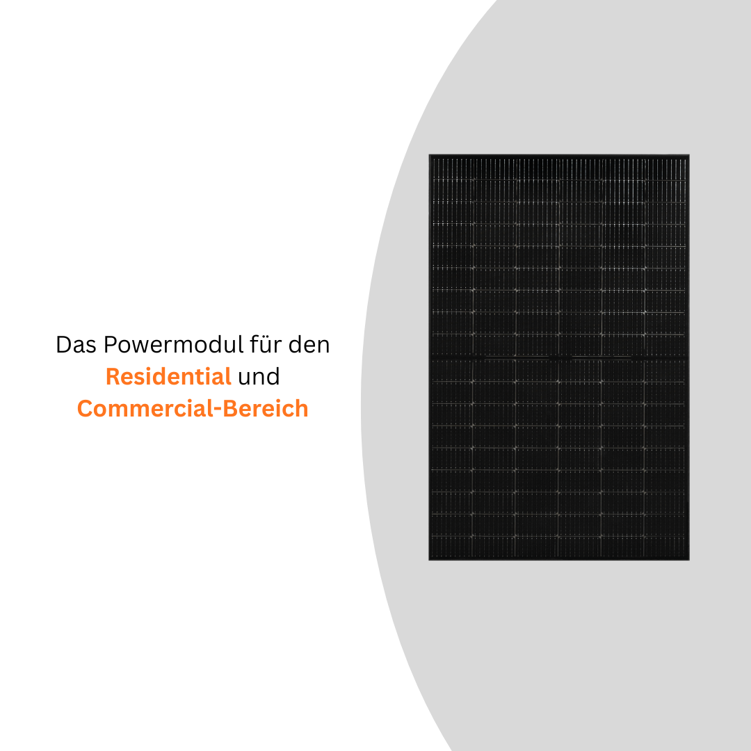Bifaziales Doppelglas-Modul in schwarzer Optik mit transparenter Rückseite und N-TYPE/TOPCon-Zelltechnologie. Das Powermodul für den Residential- und Commercial-Bereich.